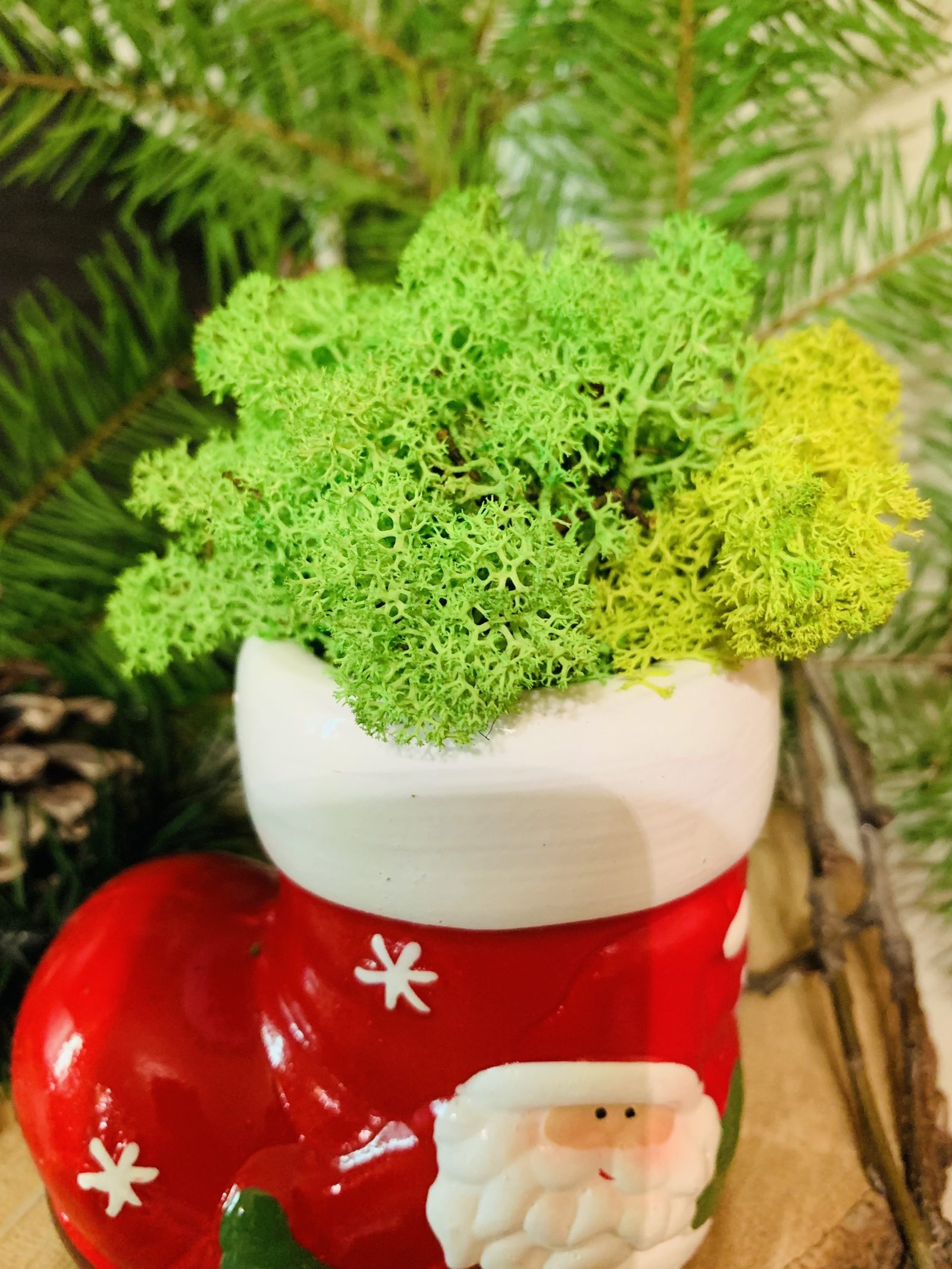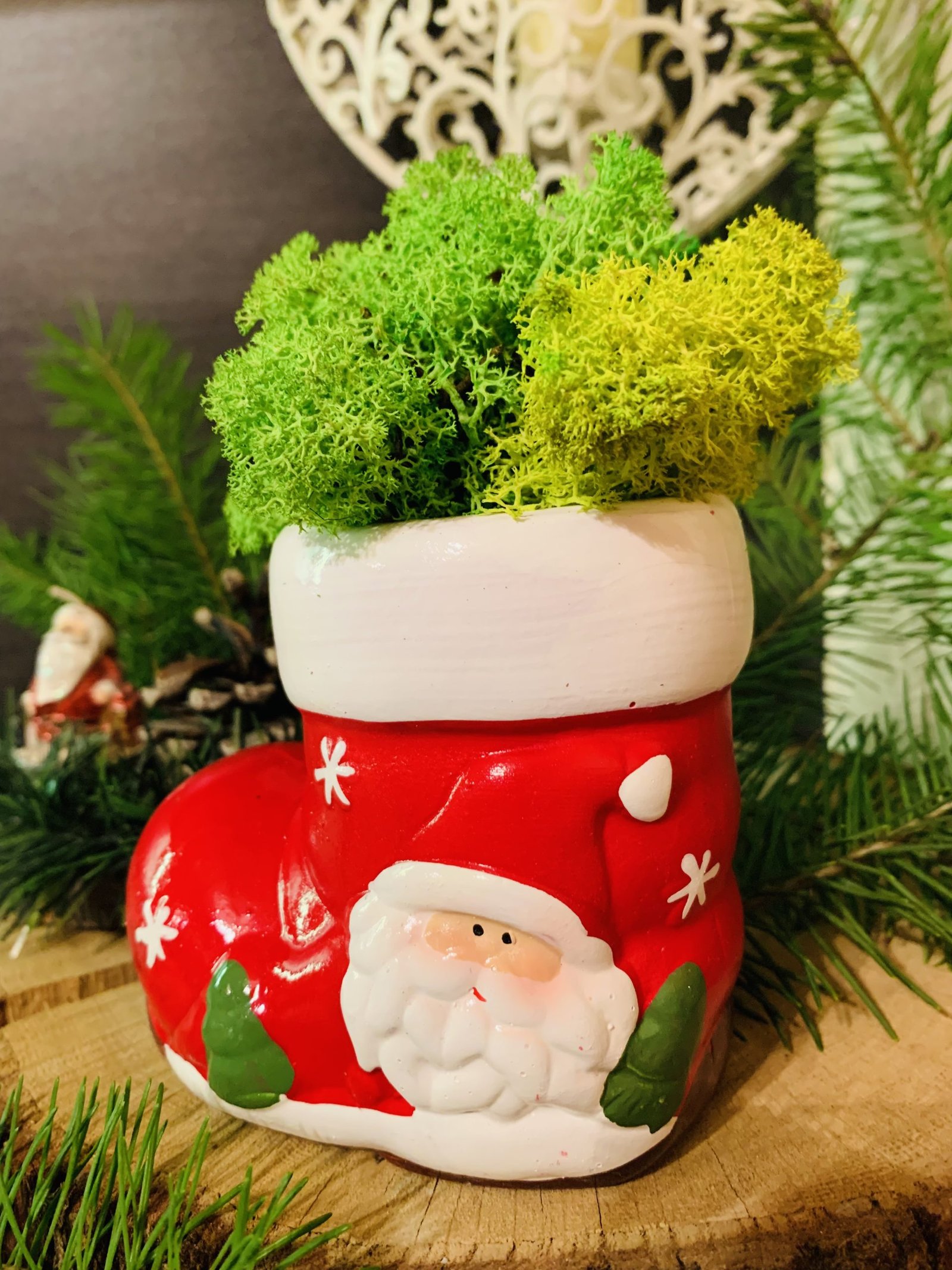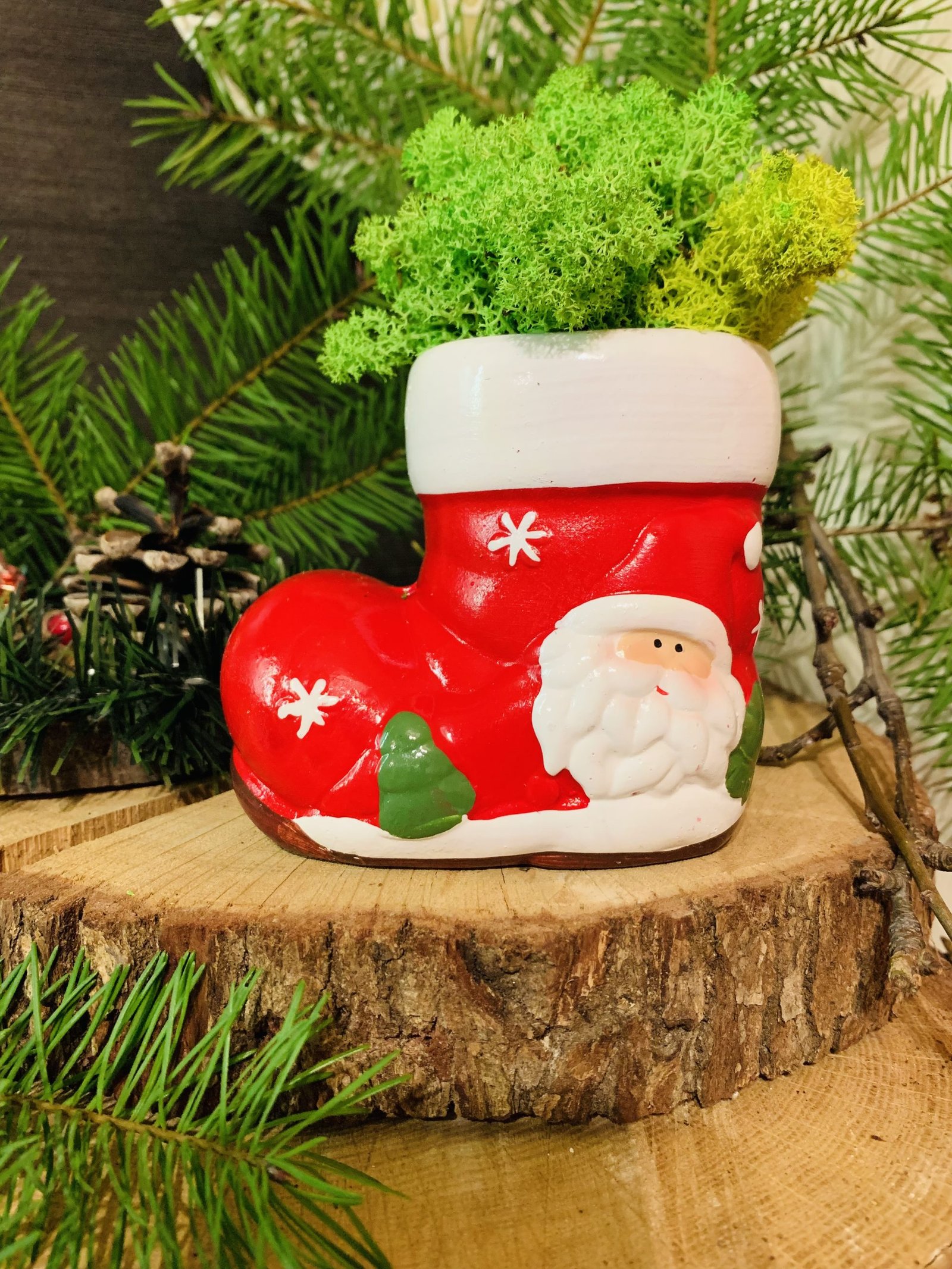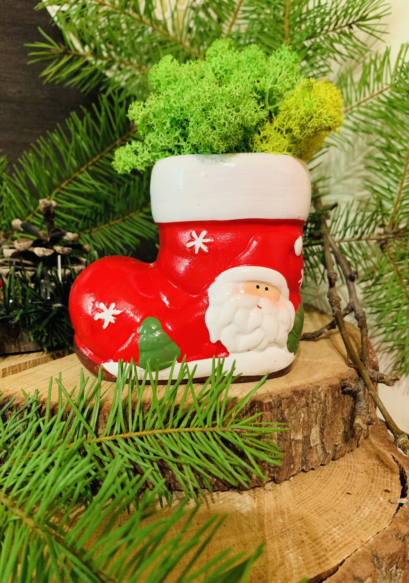 Закачлив коледен ботуш, украсен с естествен скандинавски мъх, идеален за празничен декор.